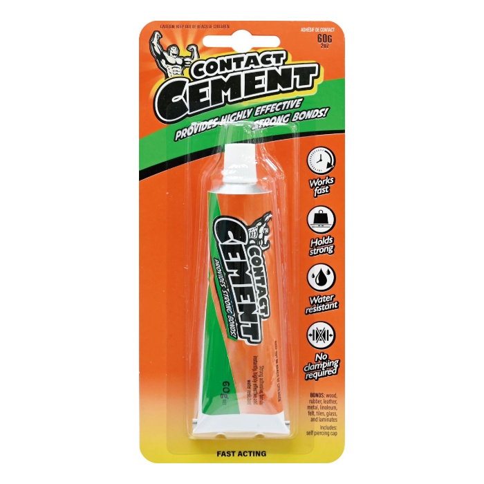 60g tube of Contact Cement, a multi-purpose adhesive designed for permanent, high-strength bonds. This “Fast Acting” formula is specifically designed to bond on contact, eliminating the need for long-term clamping.