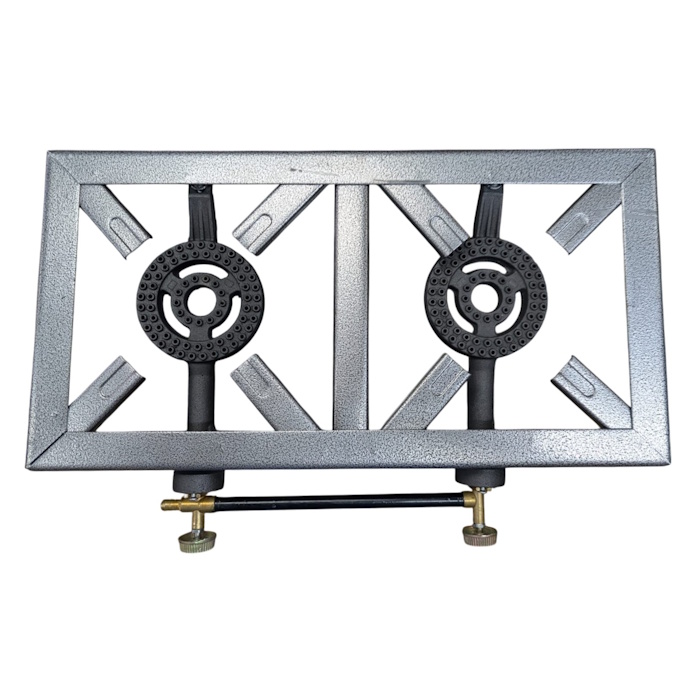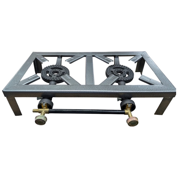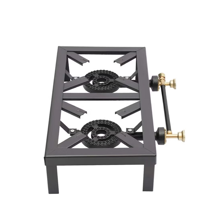 The stove is a Double Burner Angle Iron Stove, a heavy-duty portable gas cooker commonly used for outdoor cooking, camping, and catering. This stove is made from durable iron frames with cast iron burners designed to withstand heavy pots and high heat.