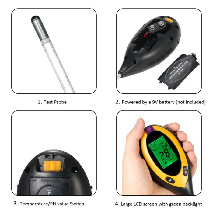 This 4-in-1 digital soil pH meter measures pH, moisture, sunlight, and temperature with a sensitive 200 mm/8-inch probe and light sensor window. It features an oversized LCD with a backlight and auto power off, and delivering accurate results for indoor and outdoor plant care, so that you can take better care of your plants, so that they can be healthy and thrive after being well taken care of!. Compact and lightweight design, featuring a digital display and a long-lasting 9V battery, ensures portability and convenience.